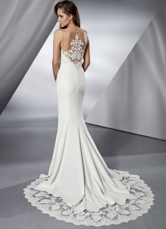 Blanca is a comfortable, sleek and sophisticated wedding gown, made from crepe & lace fabric. The dress has a sweetheart neckline covered with floral lace to create an illusion neckline.  The dress has a figure hugging silhouette that is accentuated by the crepe material as well.