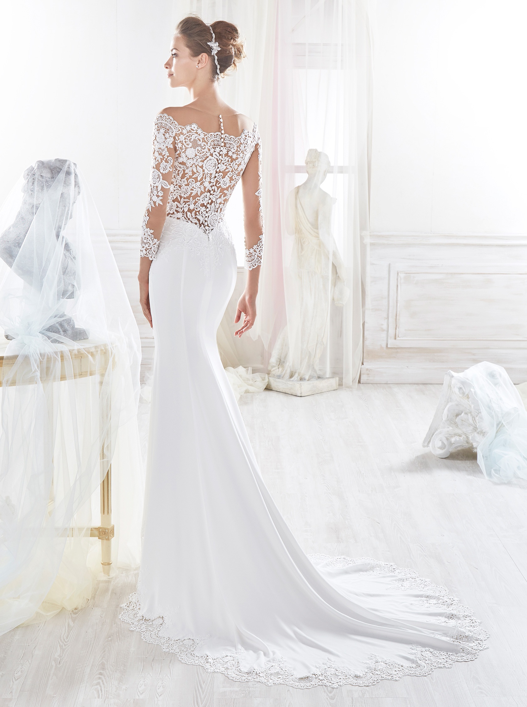 An elegant wedding gown and a very popular style. This beauty features a stretch crepe skirt, lace sleeves and sweetheart/illusion neckline. Elegance deluxe.
