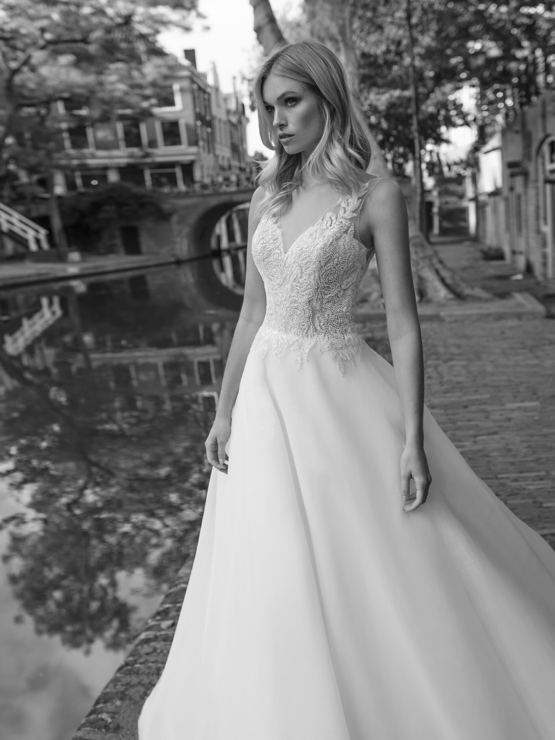 Ballgown Kelly is classic, dreamy and totally timeless with a modern twist. The bodice is covered with sparkly beaded lace with an elegant clean V-neckline. The gorgeous organza skirt with sparkling tulle underneath will make you shine bright on your wedding day. The V-backline completes this feminine bridal look. This dress is also available with a plain skirt with regular tulle underneath the layer of organza.