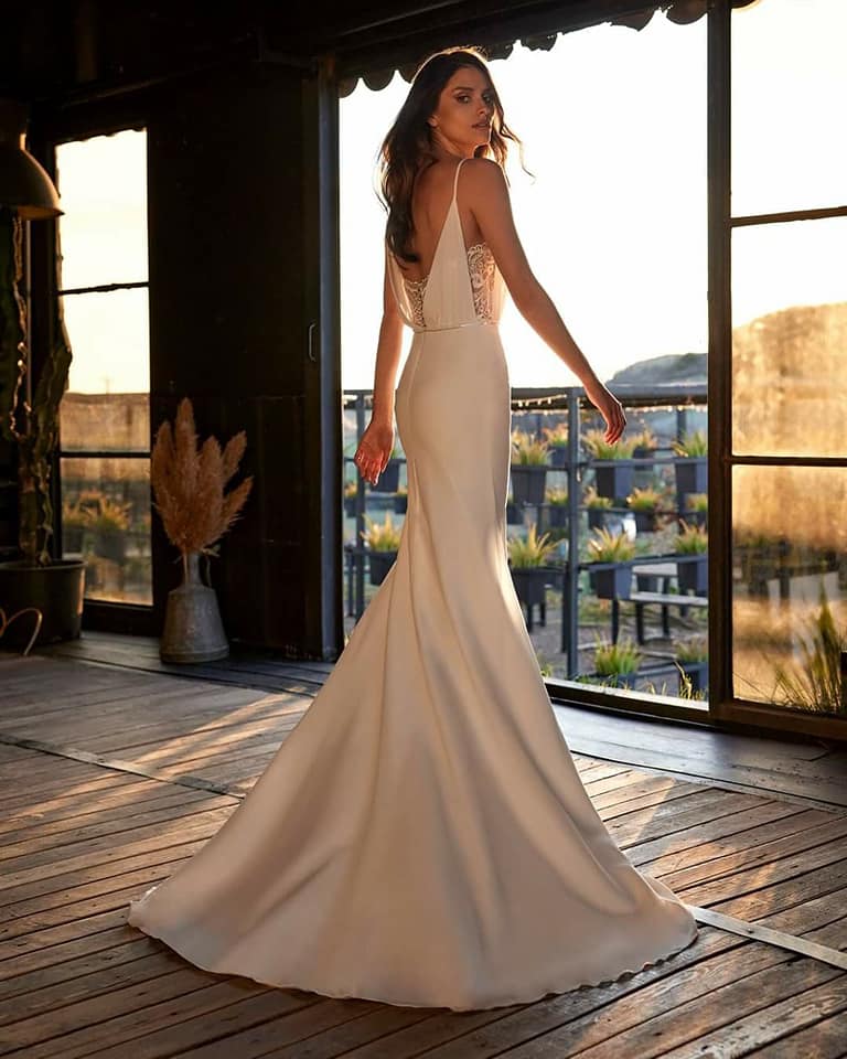 The Genoa bridal gown is a sleek trumpet gown with a unique, eye-catching design. Genoa’s bodice features a classic sweetheart neckline adorned with intricate lace that blends perfectly with sophisticated chiffon fabric. With a fitted skirt that flows into a dramatic chapel train, Genoa is a true fusion of bold design and elegant craftsmanship.