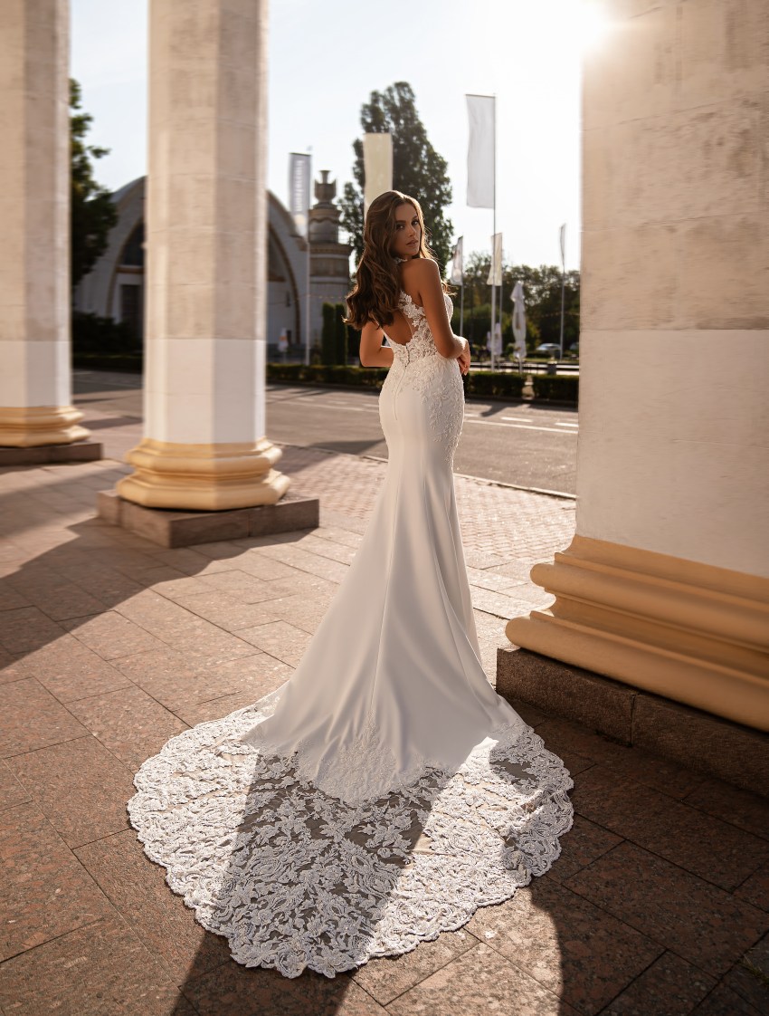 Felicia is a seductive godet, featuring a halter neckline, guipure embroidered with beads, sequins & crystals and an exquisite train!